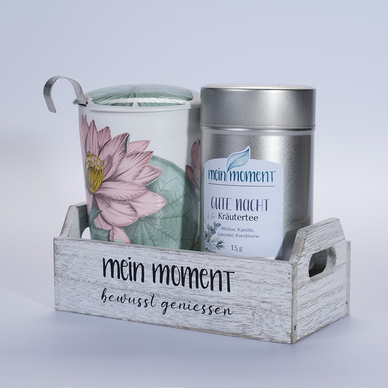 Inhalt: Kräutertee deiner Wahl (15 g in Aufbewahrungsdose), Teetasse Teaeve deiner Wahl, Holzkistchen im Vintage-Look